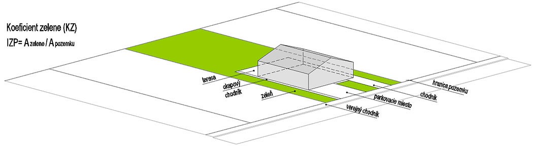 Koeficient zelene predstavuje pomer medzi započítateľnými plochami zelene, ako zeleň na rastlom teréne alebo zeleň nad podzemnými konštrukciami a plochou pozemku.