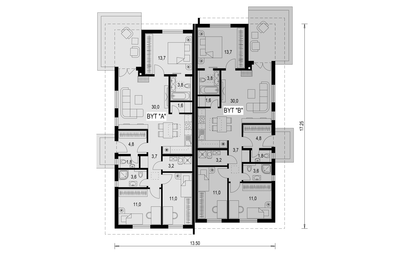 Nehnuteľnosť je súčasťou samostatne stojaceho rodinného dvojdomu s dvomi nezávislými bytovými jednotkami, ktoré majú samostatné vstupy i terasy orientované zo vzájomne opačných strán objektu. Bude odovzdávaná v stave dokončenia „holodom“, čo okrem iného zahŕňa: osadené plastové okná s izolačným trojsklom a dvere farby antracit, vonkajšie žalúzie ovládané aj z mobilnej aplikácie, vstupné dvere, namontované teplovodné podlahové vykurovanie s možnosťou regulovania teploty v každej miestnosti, rekuperácia a tepelné čerpadlo, kompletná úprava pozemku, nainštalovaný zavlažovací systém, oplotená väčšina pozemku, funkčné spevnené plochy.