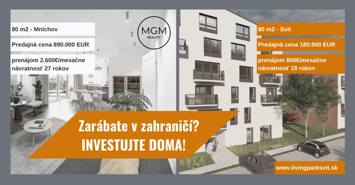 No a nakoniec sme zavítali do Nemecka a vybrali sme si Mníchov.  Porovnávali sme 80 m2 byt s mestom Svit, ktoré je už v súčasnosti predmestím Popradu. V Mníchove sa takýto byt dá kúpiť za cca 900tis. EUR. Nájom sa pohybuje vo výške 2600 EUR/ mesiac. Návratnosť obstarávacej ceny je 27 rokov.  V projekte www.livingparksvit.sk stojí 80 m2 byt 180.900 EUR. Prenajmete ho za 800 EUR/ mesiac. Návratnosť 19 rokov.  Čiže opäť z pohľadu návratnosti kúpnej ceny klient kúpou bytu vo Svite „ušetrí“ 8 rokov. Pokiaľ máte záujem o bezplatnú konzultáciu, kontaktujte nás telefonicky na tel:00421910861186 alebo e-mailom na reality@realitymgm.sk